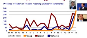 Lo decisivo es que Clegg y los liberales demócratas han superado el umbral de percepción mediática. Así lo demuestra el análisis de contenido realizado por Media Tenor (pdf). Según su autor, Roland Schatz, los liberales demócratas habían recibido en los meses anteriores un tratamiento positivo de los medios, pero no lograban la necesaria visibilidad. Antes de los debates, la campaña electoral era representada como una carrera entre dos partidos, conservadores y laboristas, que monopolizaban el 90% de las informaciones, con sólo el 4% dedicadas a los liberales demócratas. Ahora Clegg se coloca al mismo nivel que Cameron y por encima de Brown. El cambio ha sido radical como muestra este cuadro de las declaraciones de los tres líderes.