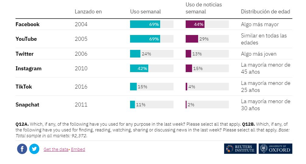 En el Informe del Reuters Institute para el Periodismo de 2023 (que se basa en amplias encuestas país por país) no solo se hace un repaso de la situación de la información online, que es su objetivo principal., sino que también pueden encontrarse conclusiones generales sobre el estado del periodismo. Entre sus conclusiones: el público llega cada vez más a las noticias digitales a través de las redes sociales, en lugar de a través de los sitios de los medios. En cuanto a las redes sociales que más crecen (sobre todo entre los más jóvenes) son las más visuales como Tik Tok o instagram.